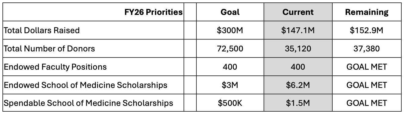 Please continue to reach out to Hudson Clare early in your donor conversations, especially around scholarships. His involvement is essential as the School of Medicine finalizes the structure of scholarships for students. |